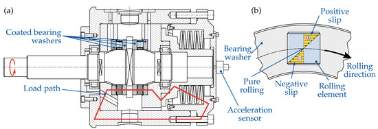 In order to verify the functionality of the molybdenum-based system, the coated specimens were subjected to tribological stress in a modified FE8 test rig. Different types of rolling bearings can be used in the test rig. A test head for cylindrical roller thrust bearings designed by the IMKT Hanover was used for these investigations. According to the standard DIN 51819 [21], the test rig was designed for fatigue and wear tests on rolling bearings using automotive and industrial lubricants such as oil and grease. However, the investigations in this paper are focused mainly on the lubrication mechanism of a solid lubricant. In the FE8 test head, two thrust bearings of type 81212 were mounted on one shaft, see Figure 2. Because of the geometry of cylindrical roller thrust bearings, a pure rolling motion will only occur in the center of the rolling element. In the other areas further outside and inside, slip between the rolling elements and the housing or shaft located washer will occur (Figure 2b). This relative movement increases towards the rolling element ends and reaches a slip level of up to 14%, depending on the operating conditions.
