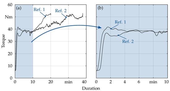 Overview of reference tests Ref. 1 and Ref. 2: (a) Frictional torque of the reference experiments to determine the operating life without lubricant displayed over the operating time. (b) Frictional torque curves observed in more detail from (a). Shown are the first 10 min with focus on the running-in behavior.