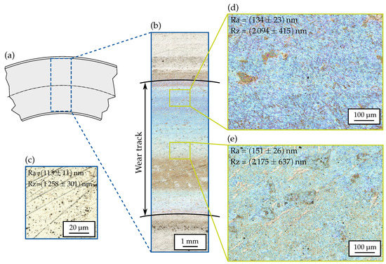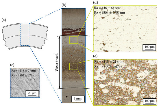 Damage analysis of the reference specimen Ref. 2 by 3D laser scanning microscope: (a) Principal section view of a bearing washer. (b) Wear track of the reference specimen after a test duration of 38 min. (c) Bearing washer in initial state with measured roughness parameters and . (d,e) High magnification microscopic view of the wear area with Ra and Rz.