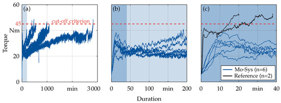The first experiments with cylindrical roller thrust bearings without lubricant gave information about the system behavior; the investigation was repeated with the molybdenum trioxide coatings, taking the determined cut-off criterion into account. The operating life is the time until the cut-off criterion (max. frictional torque of 45 Nm) is reached. The time series of the measured torque is shown in Figure 5. The horizontal red line displays the cut-off criterion. During the test, different behavior and interesting operating conditions occurred. Therefore, the tests are presented in three diagrams. On the one hand, this allows an overview of the entire series of tests to be presented in terms of time, and on the other hand, the run-in-specific operating characteristics can be described.