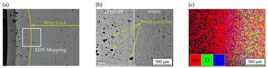 In Figure 7b an SE image is shown for an overview of the generated EDX mapping. This makes it possible to visualize the remaining wear particles after the test and to visualize the worn surface sufficiently. The separation of the different elements itself is shown in Figure 7c by the EDX composite spectrum.