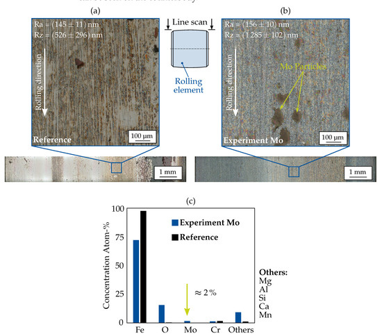 Surface analysis of the rolling elements: (a) Representation of the reference experiment. Significant accumulation of oxides due to tribo-oxidation and partial cold welding could be observed. (b) Mo-based system induced a homogeneous change in the color of the surface. (c) EDX analysis of the Mo-based and the Reference experiment after the tests.