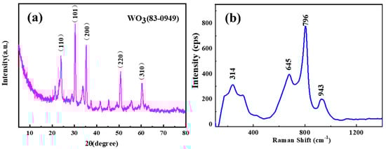The XRD and Raman of the products prepared in the experiment are shown in Figure 1. It can be seen from Figure 1a that the five diffraction peaks between 20° and 70° are representative peaks of WO3 (JCPDS No. 83-0949) of the trioblique phase, which are (002), (020), (202), (400), (214), respectively. Other peaks also fit the standard card. There are no other diffraction peaks, indicating very high purity of the sample. The diffraction peak is narrow and sharp, indicating that the crystallization degree of the prepared product is high. Figure 1b shows the Raman spectrum of WO3 thin film. There are clear strong spectra at 314, 645, 796, and 943 cm−1. The strong frequency band of 796 cm−1 corresponds to a symmetric tensile vibration [], and the strong frequency band of 645 cm−1 corresponds to the asymmetric tensile vibration of the W-O bond. The band in the range of 300~600 cm is caused by the bending vibration of the O-W-O bond []. Concerning the basal peak at 943 cm−1, in the literature [], this band is usually assigned to the stretching mode of the W = O double bond. The results are consistent with the XRD analysis and confirm the formation of WO3. In order to observe the morphological features of WO3 nanowires, we carried out SEM tests on the material, as shown in Figure 2. Figure 2a is the SEM picture of the nanowires. It can be seen that a large number of nanowire structures are formed on the foam nickel conductive substrate by the WO3 nanomaterials.