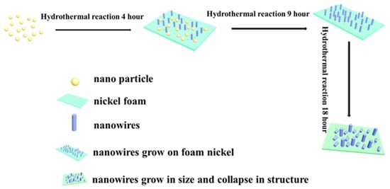 Figure 3a is the SEM image of the hydrothermal reaction for 1 h. We can find from this figure that a large number of particles are closely arranged and combined with each other to form clusters of particles. Figure 3b shows the SEM image of the hydrothermal reaction for 4 h. It can be found that there are many linear nanostructures interlaced with each other, but a small number of cluster particles can still be found. When the reaction time reaches 9 h, we can see a large number of nanowires, and the presence of cluster particles is almost invisible. When the reaction time is 18 h, it can be seen from Figure 3d that the nanowires obtained will become larger and aggregate or fragment. The nanowires become larger in size, and the linear structures collapse and pile on top of each other. Through the above analysis, we obtained the schematic diagram of the formation of WO3 nanowires, as shown in Figure 4.