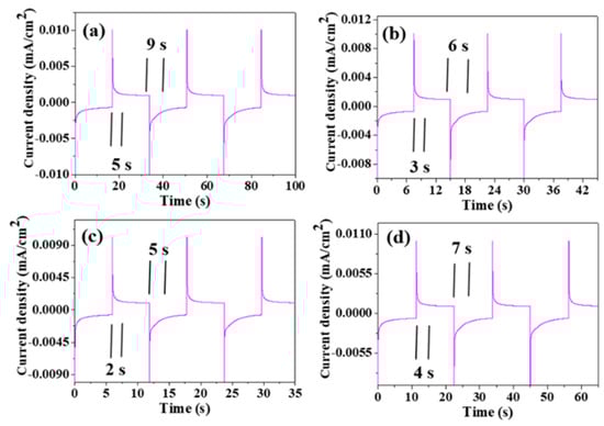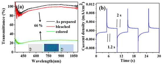 The current-time response is shown in Figure 6b. The dyeing reaction time was about 1.2 s, and the bleaching reaction time was about 2 s. In order to study the influencing factors of a WO3 electrochromism, we analyzed the electrochromism mechanism of WO3 in the lithium-ion electrolyte. The principle can be explained as follows: electron insertion/stratification and the charge balance of lithium ions, which determine the coloration/bleaching process of WO3 []. In addition, coloration efficiency (CE) is one of the most commonly used methods to determine the effective optical transmission with the change of the applied voltage. Coloring (Tc) or bleaching (Tb) occurs at certain wavelengths when the film is exposed to sunlight. Color efficiency (CE) is the ratio of the optical density (OD) to the charge density (Q) per unit area []. The relevant formula is as follows: