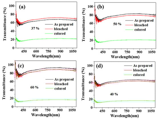 In order to accurately understand the WO3 transmittance at different hydrothermal reaction times, we analyzed the transmittance at 1 h, 4 h, 9 h, and 18 h under the same conditions, as shown in Figure 7. As can be seen from Figure 7, the transmittance of WO3 9 h (60%) > WO3 4 h (50%) > WO3 18 h (40%) > WO3 1 h (37%). The change in light transmittance of the hydrothermal reaction for 9 h is the largest, indicating that the electrochromic performance is the best, which is consistent with the above analysis. The excellent electrochromic properties of WO3 nanowires are attributed to the excellent WO3 material and nanowire array, which effectively improve the porosity of the material, improve the specific surface area and active site of the material, provide more channels, accelerate the rate of ion implantation and extraction, reduce the accumulation of ions, and accelerate the diffusion rate. We compare our research work with other literature, such as Table 1.