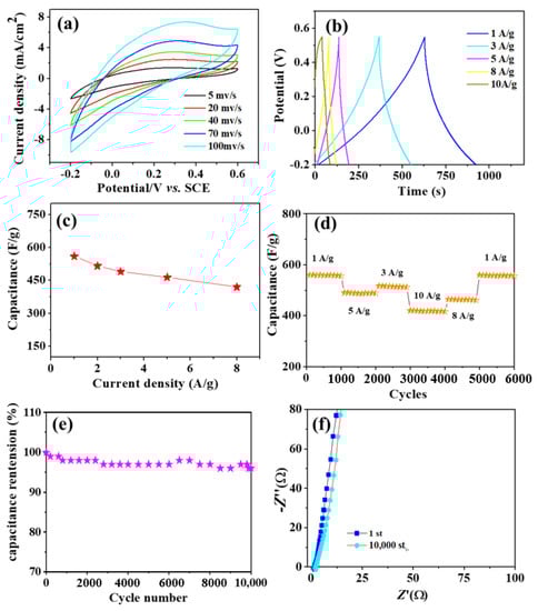 Electrochemical characterization of the WO3 nanowires film in a three−electrode system. (a) CV curves of WO3 nanowires at a scan rate of 5, 20, 40, 70, and 100 mV/s; (b) charge/discharge curves at current densities of 1, 3, 5, 8, and 10 A/g; (c) plot of the current density against the specific capacitance of WO3 nanowires; (d) the cycling performance of the WO3 nanorods tested at different current densities; (e) cycling performance at a discharge current density of 2 A/g; (f) the electrical conductivity of the product for the first and last 10,000 cycles of the Nyquist plots.