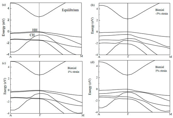 - Yang, S.; Prendergast, D.; Neaton, J.B. Nonlinear variations in the electronic structure of II–VI and III–V wurtzite semiconductors with biaxial strain. Appl. Phys. Lett. 2011, 98, 152108. [Google Scholar] [CrossRef]