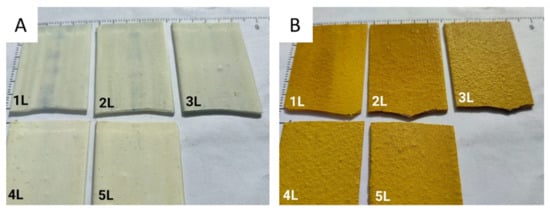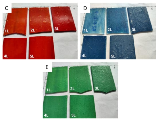 In order to study the influence of the thickness of the paint layer on the reflectance, we used the optimal pigment: binder combination. Thus, 1 g of each pigment was mixed with 1 mL of linseed oil to make the diverse paint samples. Once the consistency of each mixture was deemed suitable, up to five layers were applied to the glass microscope slides (Figure 1). Each layer was applied when the previous layer was completely dry, i.e., after an interval of one month. The single layer mock-up paintings made with lead white (LW, Figure 1A) and azurite (AZ, Figure 1D) were translucent, so that the sample label was visible under the paints, mainly in the AZ sample. We have included these samples here for comparative purposes, i.e., to highlight differences between paints made with different pigments. In this case the painting mock-ups were identified by the pigment code (LW, OR, CIN, AZ, MAL) followed by the number of layers applied (1L to 5L). All painting mock-ups were prepared under laboratory conditions (20 ± 5 °C and RH 40 ± 10%).