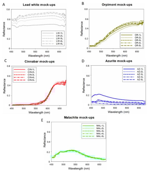 For the CIN and MAL mock-ups (Figure 5C,E), the spectra of the paintings with different binder amounts were more similar to each other than to the spectra of the other paint mock-ups. Moreover, the spectra overlapped throughout the wavelength range. However, as the amount of oil that accumulates on the painting surface depends on how it is applied (as mentioned in the previous section), different reflectance spectra can be expected.