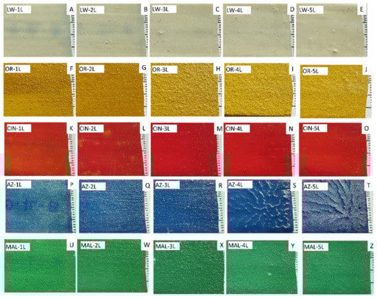 The particle sizes reported by the supplier were not as accurate as those determined by the laser particle size analyzer (Table 1), since the primary and also the secondary (when identified) maximum particle sizes, and the particle size range for each pigment should be included, as indicated in []. In the current research, the primary maximum particle size for all pigments was less than the maximum grain size reported by the supplier (Table 1). The coarsest (largest particle size) pigment was OR, followed by AZ and CIN, and the finest (smallest particle size) pigment was LW. Although the primary maximum particle size of the MAL pigment was 3 µm (as for LW), a secondary maximum particle size (ca. 70 µm) was also detected. The range of sizes detected for MAL pigment was relatively wide (0.2–200 µm).