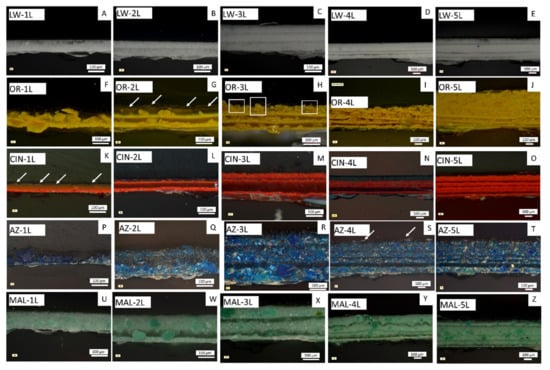 Cross-sections of the mock-ups under polarized light microscopy (transmitted light and cross polar modes). The samples were examined to determine the influence of the thickness of the paint layer (one layer to five layers, 1L to 5L) on the spectral reflectance. (A–E): lead white (LW)-based oil painting mock-ups. (F–J): orpiment (OR)-based oil painting mock-ups. (K–O): cinnabar (CIN)-based oil painting mock-ups. (P–T): azurite (AZ)-based oil painting mock-ups. (U–Z): malachite (MAL)-based oil painting mock-ups. Arrows indicate the accumulation of binder and rectangles indicate grains protruding from the binder.