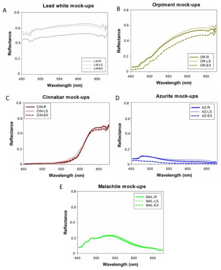 Reflectance spectra of the painting mock-ups used to determine the influence of the binder quantity (O-optimal quantity-, LS-low binder- and EX-excess binder-) on the reflectance. (A) Lead white (LW)-based oil painting mock-ups. (B) Orpiment (OR)-based oil painting mock-ups. (C) Cinnabar (CIN)-based oil painting mock-ups. (D) Azurite (AZ)-based oil painting mock-ups. (E) Malachite (MAL)-based oil painting mock-ups.
