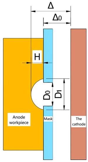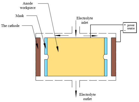 The principle of the mask electrolytic machining ring cell is shown in Figure 1. Mask insulation, anodic workpiece exposed area, and electrolyte contact follow Faraday’s law and continue to dissolve until etched to meet the requirements of the shape [26,27].