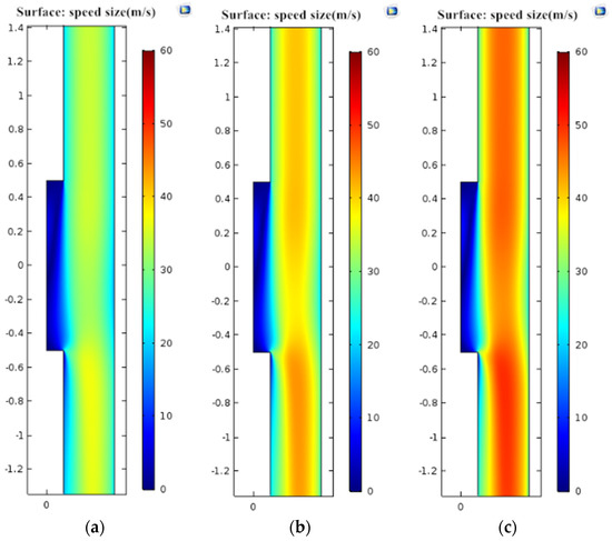 Velocity between poles under different inlet pressures. (a) 0.20 Mpa; (b) 0.23 Mpa; (c) 0.25 Mpa.