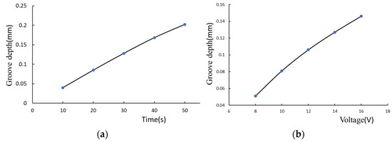 Slot depth variation diagram. (a) The relationship between the depth of the slot and the processing time (15 V); (b) The relationship between the depth of the slot and the processing time (30 V).