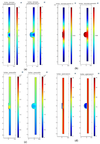In order to ensure the smooth progress of the mask electrolytic machining and the timely discharge of electrolytic products and heat, large electrolyte pressure and flow rate are needed at the machining gap. As shown in Figure 9c,d, the flow rate of the small electrolyte between the two poles is faster at the initial time of machining. With the removal of the anode workpiece, the gap between the large electrodes becomes larger with the removal of the anode workpiece because the constant inlet flow rate leads to a decrease in pressure and flow rate. Due to the continuous etching process, the gap between the anode and the cathode will become larger, the flow of the electrolyte in the deep groove will be blocked, the speed of the electrolyte will be slow, and the processing stability will be affected.
