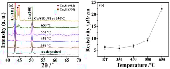 (a) The phase evolutions for Cu(Re)/SiO2/Si annealed at various temperatures and Cu/SiO2/Si annealed at 350 °C. (b) Electrical results for Cu(Re)/SiO2/Si samples before and after annealing at various temperatures.