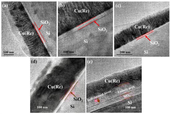 High-resolution image of the Cu(Re)/SiO2/Si interconnect structure at various temperatures: (a) as-deposited, (b) 350 °C, (c) 450 °C, (d) 550 °C and (e) 650 °C.