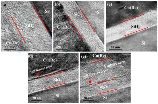 The high-resolution cross-sectional TEM (HRTEM) images of the interfaces for the Cu(Re)/SiO2/Si structure are depicted in Figure 3. Clear interfaces were observed in the as-deposited Cu(Re)/SiO2/Si interconnect structure, as shown in Figure 3a. The Cu layer and the SiO2 layer were polycrystalline and amorphous, respectively. For the samples annealed at 350 and 450 °C, the interfaces remained unchanged compared with those of the as-deposited sample (Figure 3b,c). With the aid of HRTEM, a clear interfacial reaction product, approximately 2 nm in thickness, was found at the Cu(Re)/SiO2 interface after annealing at 550 °C, as indicated in Figure 3d. Moreover, the white line at the Cu(Re)/SiO2 interface implied a slight atomic diffusion. We consider that the white line might be the copper silicide, even though the XRD results reveal the absence of copper silicide. For the sample annealed at 650 °C, the ~55 nm Cu(Re) layer was completely destroyed due to atom diffusion, as depicted in Figure 3e. The discontinuous black line still existed at the Cu(Re)/SiO2 interface. This indicates that the Cu(Re) alloy began to fail as a barrier layer.