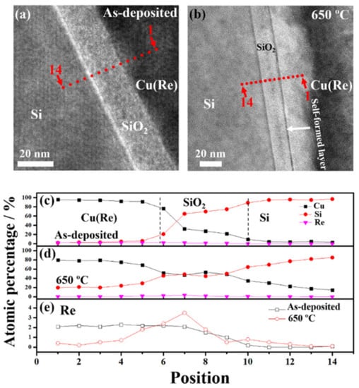 Figure 4a,b present the fourteen points, which were perpendicular to the interfaces, selected for the EDX-STEM experiment. The component distribution of the as-deposited sample and Cu(Re)/SiO2/Si sample annealed at 650 °C was assessed using EDX-STEM experiments, as shown in Figure 4c,d. The approximate interfaces of Cu(Re)/SiO2 and SiO2/Si are indicated by black dashed lines in Figure 4c. The component distribution of the O element cannot be measured correctly by the means of the EDX method. Consequently, it is not shown in Figure 4c,d. According to the EDX-STEM depth profiles, as shown in Figure 4c, the as-deposited Cu(Re) film contained about 2.1 at.% Re. The component distribution of the as-deposited sample showed a sharp variation, indicating a distinct interface structure. After annealing, the slopes of the Cu and Si signals in Figure 4d were flatter than those in Figure 4c. This implies that Cu atoms diffused further into the Si substrate in the Cu(Re)/SiO2/Si sample annealed at 650 °C. Figure 4e displays the profile composition of Re for the as-deposited sample and Cu(Re)/SiO2/Si sample annealed at 650 °C. The distribution of Re in the Cu layer in the as-deposited sample maintained a steady value of ~2.1 at.%, and then the value decreased to 0 at.% as it approached the Si substrate. On the contrary, the Re signal was higher in the SiO2 layer in the stack annealed at 650 °C. The above experimental results prove that an obvious enrichment of Re can be detected at the Cu(Re)/SiO2 interface. Thus, the black line as observed in Figure 3d,e was interpreted as the self-formed rhenium-enriched layer. It can be concluded that a minor amount of Re doping plays an indispensable role in the improvement of the barrier properties of pure Cu layers.