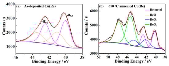 The chemical states of Re at the Cu(Re)/SiO2 interface were analyzed using the XPS method [33,34]. Figure 5 displays the XPS spectra of Re 4f measured at the Cu(Re)/SiO2 interface of the as-deposited film and Cu(Re) film annealed at 650 °C and their fits. For the as-deposited sample in Figure 5a, the peaks at 42.5 and 40.1 eV are characteristic of Re metal, and those at 43.5 and 41.1 eV are characteristic of ReO [35]. This indicates that Re exists at the interface in the chemical form of Re metal and ReO. The fits of the Re 4f photoemission spectra for the sample annealed at 650 °C prove the existence of two additional rhenium oxides in Figure 5b. The doublet at 44.5/42.1 eV was assigned to the Re (IV) oxidation state (ReO2 oxide), and that at higher binding energies 47.7/45.3 eV was assigned to Re (VI) oxidation states (ReO3 oxide) [36]. Specifically, the self-formed layer consisted of Re, ReO2 and ReO3. Generally, ReO3 is known to be very unstable at high temperature and disproportionates to Re 7+ (Re2O7) and Re 4+ (ReO2) upon heating above 400 °C [37,38]. The thermal decomposition is accompanied by the disproportionation reaction [38]