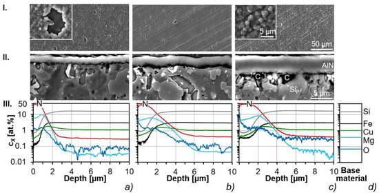 The chemical composition and/or microstructure of the substrate played an important role in the diffusion-controlled nitriding process. The concentration–depth profiles measured by means of GDOES show the strong enrichment of nitrogen, magnesium, and oxygen in the area of the nitride layers (III. in Figure 2a–c) compared to the initial nominal composition of the Al base material (III. in Figure 2d). While nitrogen was deliberately added during nitriding to form AlN, the enrichment with other elements (except oxygen) resulted from diffusion processes within the Al base material.