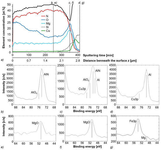 Furthermore, Cu fractions bound in CuO were also detected directly below the interface by means of the Cu2p3/2p-peak fit. The elements bound in the nitride layer as nitrides or in oxides, such as Al, Mg, and Cu, were also identified as metallic components (see Figure 3b–d).