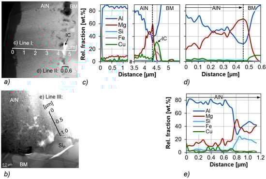 Figure 4 shows EDS line profiles measured within the AlN layer starting from different microstructural constituents of the substrate at the interface (cf. Figure 4a,b):