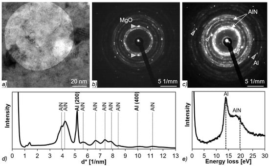 The AlN produced strong ring patterns in the diffraction image (Figure 5c). It was concluded from this that the nitride layer consisted of a great number of very small stochastically distributed AlN crystallites. Assuming that the aperture diameter was approximately 100 nm and the sample was significantly thinner, the grain size could be estimated to be <10 nm, which is confirmed by data in the literature [36,37].