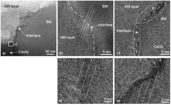The interface was not smooth, and a heavily disturbed area was visible due to the dark shadows (Figure 6b,c). The nitride layer was predominantly coherently bonded to the Al matrix, i.e., the lattice planes of the Al matrix continued within the layer (cf. Figure 6b, I. in Figure 6c,d). Due to epitaxy, nucleation on fcc Al grains began in crystallographically favourable orientations to reduce interfacial energy. On the other hand, there were also areas with incoherent bonding at the interface (II. in Figure 6c,e).
