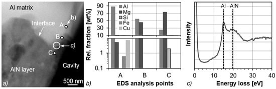 Analysis of the interface between the AlN layer and the Al base material: (a) TEM image (df) with measuring points of: (b) EDS analysis (point A–C); (c) low-loss area of the EEL spectrum.