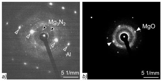 At another representative location, MgO was also detected by means of fine-range diffraction, which produced pronounced single-crystal reflections in the diffraction pattern (Figure 8b). These Mg compounds presumably formed at the beginning of the nitriding process, with their formation favoured by the higher diffusion coefficient of Mg in Al compared to the self-diffusion of Al in Al [40] and the high affinity of oxygen for Mg.