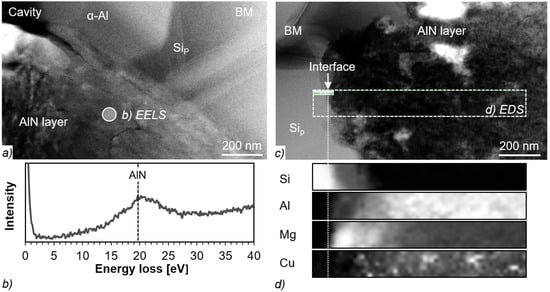 Analysis of the interface between primary silicon SiP and the AlN layer: (a) TEM image (df) of a cross section with point of EELS measuring, (b) low-loss spectrum; (c) TEM image (bf) of a cross section with an EDS measuring field; (d) EDS mapping for the elements Al, Mg, Si, Cu.
