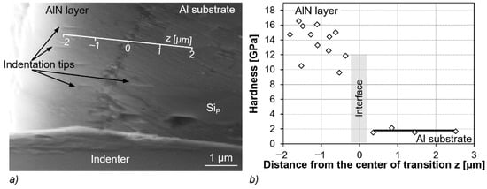 Furthermore, hardness–depth profiles were recorded by means of nanoindentation using a Picoindenter in the SEM. Due to the phenomenon of surface rounding during sample preparation, the interface between the AlN and the Al substrate was taken as a reference point z = 0 µm (Figure 10a). Hardness measurements in the AlN layer, therefore, showed negative depth values (-z), with positive depth values (z) in the Al substrate.