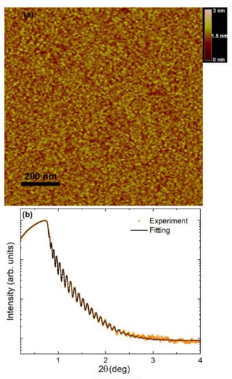Figure 2a shows the surface of a single NiFe film with thickness t = 84 nm recorded by atomic force microscope. The grain diameter is about 20 nm large and quite homogeneous in terms of size. The surface is very smooth, with an Rrms roughness of only 0.26 nm. However, if one attempts to fit the XRR data for the same sample via GenX (Figure 2b), one ends up with Rrms = 0.78 nm. The AFM value may be underestimated due to the finite radius of the AFM tip. However, both extracted RMS (GenX and AFM) values are surprisingly small for such thick films.
