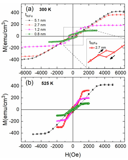 In Figure 6, we plot the temperature-dependent magnetization hysteresis loops for the multilayer with tNiFe = 5.1 nm and 6 repetitions. The loops were recorded by SQUID with the external field perpendicular and parallel to the film plane, as indicated. At 4 K, M is about 540 emu/cm3 (larger than the one of the bulk Ni which is 510 emu/cm3 due to the addition of Fe doping). M at room temperature is slightly larger than 400 emu/cm3 but less than the 480 emu/cm3 of bulk Ni. This occurs because ultrathin layers usually show a stronger temperature dependence of the magnetization than the bulk materials due to space-reduced spin wave excitations and finite size effects [10]. At all temperatures, this sample saturates easier on the film plane; thus, it shows in-plane anisotropy. However, the loops with the field applied along the film normal are not typical hard-axis loops. Those typical loops should not show any hysteresis and be linear between zero and saturation field [36]. The sigmoidal approach to saturation and the rather abrupt magnetization switch near zero field (especially at 150 K and 300 K) remind us of hard-axis loops when the system has higher-order anisotropy contributions and/or cone states, see e.g., [37,38].