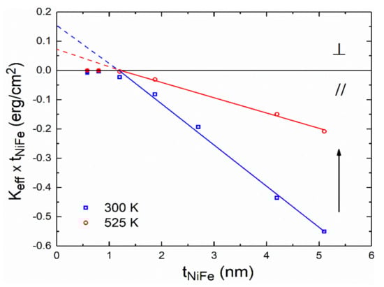 where magnetocrystalline, magnetostatic, and magneto-elastic anisotropy all contribute to KV, while interface anisotropy is represented by KS [34]. We can derive the KV value from the line’s slope, as well as the Ks value from the line’s intercept with the perpendicular axis, by applying this analysis to our experimental data points with tNiFe down to 1 nm. In this case, the experimental data points were obtained only from MOKE measurements on unannealed samples and samples annealed at 525 K. For the NiFe/NiFeO multilayers at 300 K, KS = 0.084 ± 0.010 erg/cm2 and KV = (−1.40 ± 0.06) × 106 erg/cm3. After annealing at 525 K for 90 min, the plot of the data of Keff over tNiFe showed a drastic change in both the slope of the line and the values of KS and KV. More specifically, Ks decreased to 0.032 ± 0.004 erg/cm2 and KV to (−0.52 ± 0.02) × 106 erg/cm3. We observe a small decrease in the interface anisotropy, which may be due to the increase in the layer roughness after annealing [35]. However, the volume anisotropy has decreased by more than a factor of two. The negative sign favors in-plane anisotropy. Consequently, a strong tendency towards PMS after annealing is obvious. These results are quite similar to Ni/NiO multilayers [14]. On the other hand, the Ni0.9Co0.1/NiCoO system did not present such a large enhancement of PMA after annealing [13].