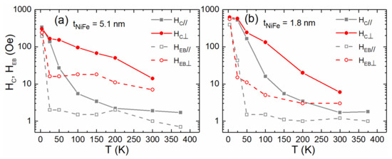 Temperature-dependent coercive and exchange fields for two multilayers with tNiFe = 5.1 nm (a) and tNiFe = 1.8 nm (b) as indicated.