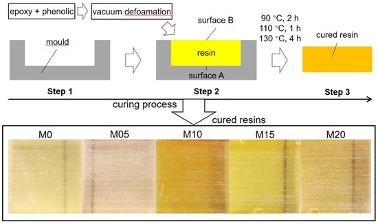 The curing process is presented in Figure 1. The resin was obtained by mixing epoxy, hardener and phenolic, and then the mixed resin was vacuumed at 60 °C to remove the air bubbles. The vacuum degassed resin was then poured into a mould containing rectangular grooves (as shown in Figure 1). The mould was made of polytetrafluoroethylene and was coated a layer of release agent before pouring the resin. After pouring the resin, the mould was put into an oven to cure the resin. After curing, the resin was cooled down naturally to room temperature and taken out from the mould, and then the cured resin was cut into resin blocks with a size of 20 mm (height) × 20 mm (width) × 10 mm (thickness). The curing temperatures were 90 °C for 2 h, 110 °C for 1 h and then 130 °C for 4 h.