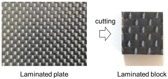 Plain woven laminated composite (PWLC, as shown in Figure 3) was also prepared via vacuum assisted resin transfer method (VATRM) to further study the effect of phenolic on mechanical properties of epoxy-based composites at different temperatures, which can reflect the interlayer bond performances. The resin was obtained by mixing epoxy, hardener and phenolic, and then the resin was vacuumed at 60 °C to remove the air bubbles before being injected into the laminated plain woven fabrics. The cured composite was cut into blocks with a size of 12 mm (height) × 12 mm (width) × 6 mm (thickness).