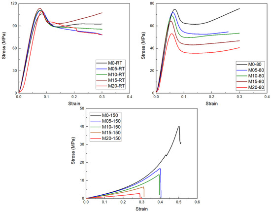 Figure 5 shows the compression stress-strain curves of phenolic modified epoxy at different temperatures. At the same temperature, the shapes of stress-strain curves had no significant change with the increase of phenolic content. At room temperature (RT) and 80 °C, the shapes of stress-strain curves exhibited elastoplasticity, whereas the shapes of compressive stress-strain curves of phenolic modified epoxy exhibited a characteristic of high elasticity at 150 °C. Moreover, at 150 °C, the failure strain of phenolic modified epoxy decreased obviously with the increase of phenolic content, and M20 had the smallest failure strain with obvious elastic-brittle characteristic. At 150 °C, the addition of phenolic increased the brittleness of epoxy. This was due to the increase of intermolecular cross-linking with the increase of phenolic content.