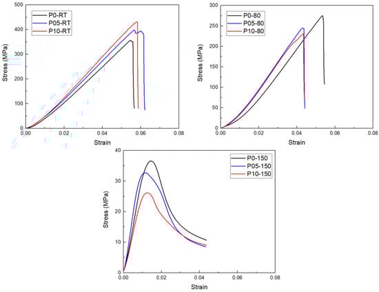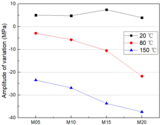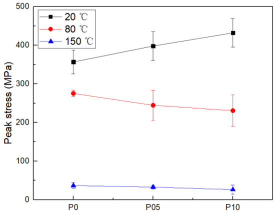 Figure 11 shows the amplitude of variation of peak stress compared with P0. The amplitude of variation in Figure 11 is the peak stress difference between the observed specimen and P0. From the point of amplitude of variation of peak stress, the PWLC’s peak stress had the largest amplitude of variation at 20 °C due to the addition of phenolic. Compared with P0, the peak stress of P10 increased by 75.3 MPa at room temperature, and decreased by 44.6 MPa at 80 °C and 10.5 MPa at 150 °C. In addition, compared with Figure 7, at room temperature and 80 °C, the phenolic influenced epoxy-based PWLCs much more than epoxy matrix.