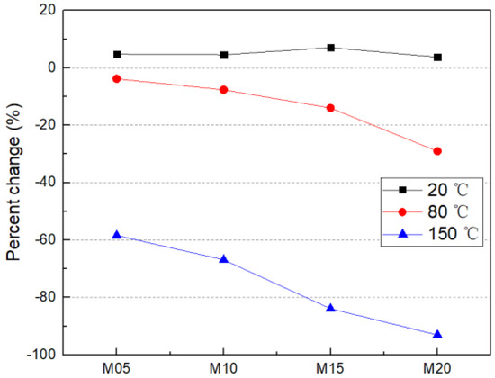 Figure 7 shows the amplitude of variation of peak stress compared with M0, and Figure 8 shows the percent change of peak stress compared with M0. The amplitude of variation in Figure 7 is the peak stress difference between the observed specimen and M0. At room temperature, phenolic could increase the peak compression stress of epoxy by about 5 MPa and 5%. However, the mechanical properties of epoxy decreased with the increase of phenolic content at 80 °C and 150 °C, and the peak stress of M20 was the lowest. At 80 °C for M20, phenolic decreased the peak stress of epoxy by 21.8 MPa and 29.1%. At 150 °C for M20, phenolic decreased the peak stress of epoxy by 37.4 MPa and 93.1%. Obviously, for the resin matrix, high temperature could magnify the adverse effect of phenolic on epoxy.