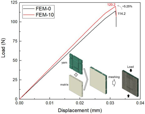 A finite element analysis (FEA) (as shown in Figure 13) was conducted on PWLC at room temperature through a representative volume element to investigate the influences of resin’s properties on the mechanical properties of PWLC. In the FEA, the interaction between fiber and matrix was assumed to be an ideal interface. The mechanical parameters of pure epoxy and phenolic modified epoxy were obtained from Figure 5. The mechanical parameters of carbon fiber are listed in Table 2. The fiber volume fraction within yarn was assumed as 65% [29] and the properties of yarn were deduced by a bridging model [30]. On the condition of an ideal interface, the curves of FEM-0 and FEM-10 were obtained based on pure epoxy M0 and phenolic modified epoxy M10, respectively.