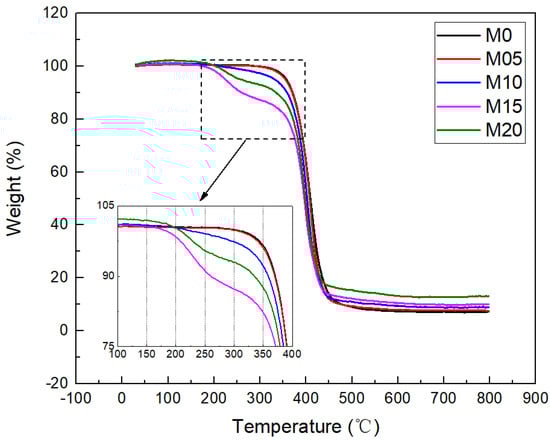 As regards the different influences on epoxy by phenolic at room and high temperatures, TG analyses were performed on M0, M05, M10, M15 and M20. The results (as shown in Figure 14) showed that the phenolic modified epoxy resins presented an earlier loss in weight at around 200 °C. There was no obvious weight decrease for M0 and M05 until 300 °C. This phenomenon may be due to the uncured or unstable micromocules. During the curing process, the addition of phenolic may lead to the formation of micromocules. At room temperature, the adverse influence of the micromocules on resin matrix was limited, whereas the increased intermolecular cross-linking had a greater influence. When in high temperature fields, the micromocules became unstable and may weaken the intermolecular forces and even lead to phase separation at high temperatures. In addition, thermal stress would form around micromocules. The adverse influences of micromocules became larger at high temperatures. All these would decrease the mechanical properties of the phenolic modified epoxy matrix and its composites.