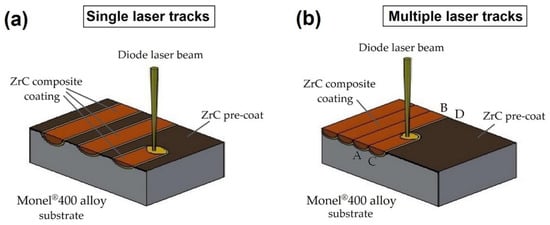 - Bartkowski, D. Influence of Laser Beam Power on Microstructure and Microhardness of Fe/ZrC Coatings Produced on Steel Using Laser Processing—Preliminary Study on the Single Laser Tracks. Materials 2022, 15, 758. [Google Scholar] [CrossRef]