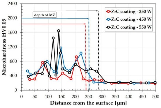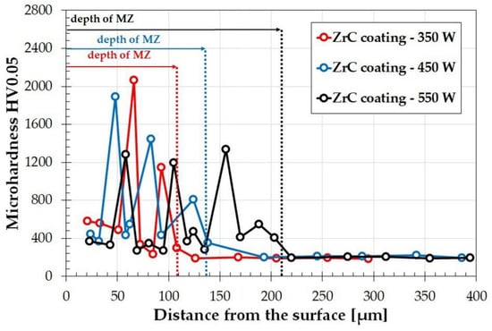 3.2.2. Microhardness of ZrC Coatings—Multiple Laser Tracks