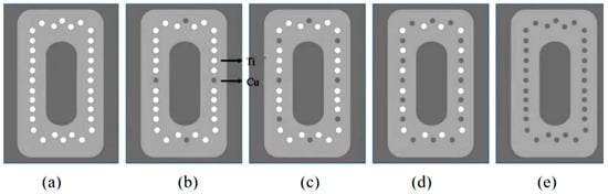 Schematic diagram of Ti-Cu mosaic target with (a) 0 Cu rods; (b) 4 Cu rods; (c) 8 Cu rods; (d) 16 Cu rods; and (e) 32 Cu rods.