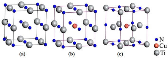 It is known that two types of impurities exist in crystals: interstitial and substitutional. It has been experimentally demonstrated that interstitial doping is suitable for systems with rsolute/rsolvent < 0.59 [32], where rsolute and rsolvent denote the radius of the solute atom and the solvent atom, respectively. It is known that substitution impurity occurs when the atomic radius and valence electron structure of the doped atom are similar to those of the crystal atom. In this study, the radii of Ti, N, and Cu were 1.45 nm, 0.80 nm, and 1.28 nm, respectively. Therefore, the possibility of Cu forming an interstitial solid solution in TiN is low, and the substitution doping is mainly formed. To further determine that whether Cu tends to occupy the Ti site or N site when doped in TiN, the formation energies of two doped models, as shown in Figure 2b,c, were calculated. The formation energies of the two models are used to calculate the Esite (occupation energy) of Cu in TiN crystal. The equation to calculate the occupation energy is as follows [32]: